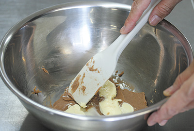 | 1)やわらかくクリーム状にしたマロンペーストに無塩バターを数回に分けて加える。さらに三温糖も加え、白っぽくなるまでしっかりと混ぜ合わせる。 | ![]() ![]() |