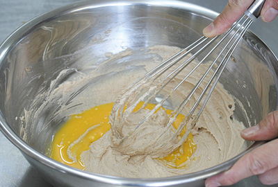 | 2)1に準備しておいたAを少しずつ加えながら混ぜる。さらにアーモンドプードルも加え合わせる。 | ![]() |