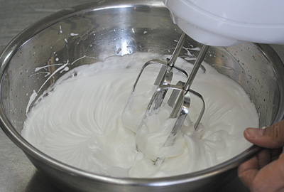 | 3)別のボールに卵白を入れて溶きほぐし、Bの1/3量を加えてハンドミキサーの高速で1分泡立てる。Bの残り半分を加えて高速で1分、さらに残りの全てを加えて低速で2分泡立て、しっかりとしたメレンゲを作る。 | ![]() |