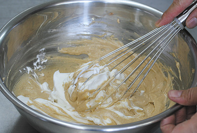 | 5)4に残りのメレンゲを加えて、メレンゲが消えるくらいまで混ぜ合わせる。 | ![]() |