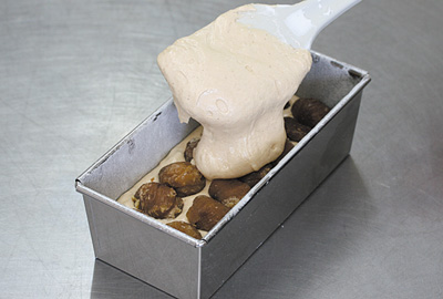 | 6)冷やしておいたパウンド型に5の生地の半量を流し入れ、渋皮付栗甘露煮をのせ、残りの生地を流し入れる。 | ![]() ![]() |