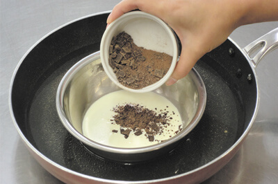 | 1) ボールに生クリームを入れて50℃程度の湯煎に当てて温め、チョコレートを加えて溶かす。 | ![]() |