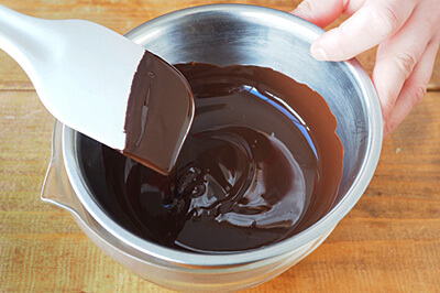 | 4)ボールにコーティングチョコレートを入れ、50℃程度の湯煎に当てて溶かす。 | ![]() |