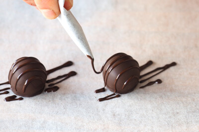 | 6)お好みでデコレーションする。 【チョコレートが固まる前に】 ・ケーキクーラーの上にのせ、フォークで転がしてツノを作る。 ・ココアをまぶす。 【チョコレートが固まったら】 ・残ったコーテイングチョコレートをコルネに入れ線描きをする。 |