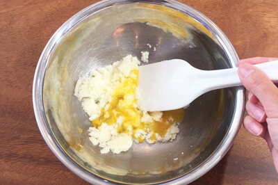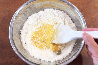 | 3)2)に準備しておいたBを加え、粉気が無くなるまで混ぜ、ラップに包んで冷蔵庫で1時間寝かせる。オーブンを180℃に温めておく。 | ![]() ![]() |