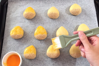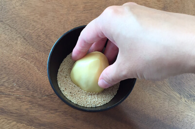 | 4)3)を10等分にして丸め、1)の白あんよりも大きめに手で押し広げ、あんを包む。 | ![]() |