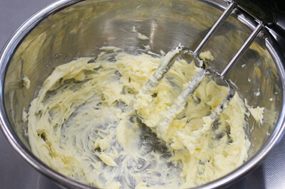 | 1)ボールに無塩バターを入れ、クリーム状になるまでハンドミキサーで混ぜる。 | ![]() |