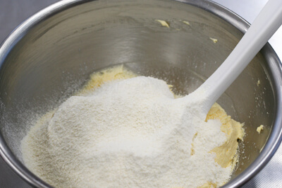 | 3)2)に全卵を7~8回に分けて加え、その都度ハンドミキサー(高速)で混ぜ合わせる。時々ボールの側面に付いた生地をゴムベラで集めて、全体が均一に混ざるようにする。 |