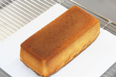 | 7)焼き上がったらすぐに15cm程度の高さから落とし(焼き縮みを防ぐため)、型から出し、逆さまにしてケーキクーラーの上で冷ます。 | ![]() |