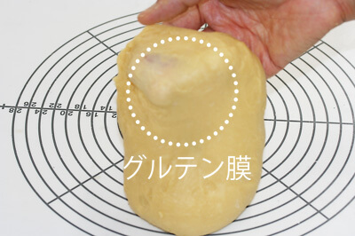 | 1-1)【生地を作る】 ボールにAの材料を入れ、泡立て器で混ぜ合わせる。 Bの材料を加えて手で混ぜ合わせる。粉気がなくなったら台の上に出して約10分、生地がまとまるまでこねる。準備しておいた無塩バターを加えてさらに約5分、生地が滑らかになるまでこねる。 ※目安:生地を引き伸ばしたとき、薄い膜(グルテン膜)が出来るくらいまで。 |