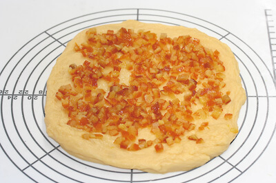 | 1-2)生地を軽く広げ、準備しておいたオレンジピールをのせ、包み込むようになじませ、均一になるまで約5分こねる。 | ![]() |