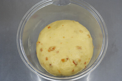 | 2)【一次発酵】 生地を丸くまとめ、とじ目を下にしてボールに入れる。 ラップをして30℃で40~50分、約2倍になるまで発酵させる。 ※目安:粉をつけた指を差し、指の跡が残る程度。 |