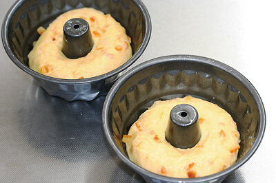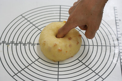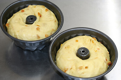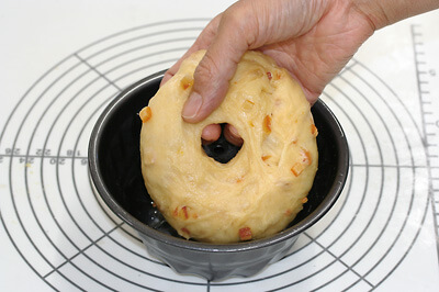 | 4-1)【成形・二次発酵】 クグロフ型にスプレーオイルをかける。 生地を丸め直し、とじ目を下にして台におく。中央に指で穴を開け、穴を広げながらとじ目が上になるようにひっくり返して型に入れる。 |