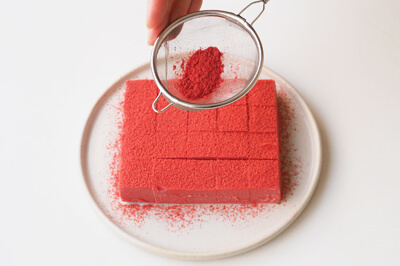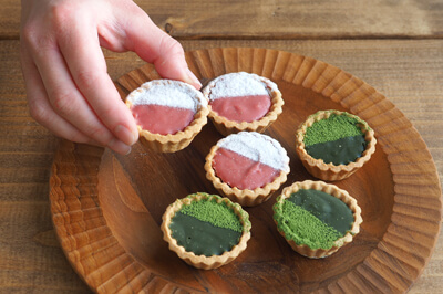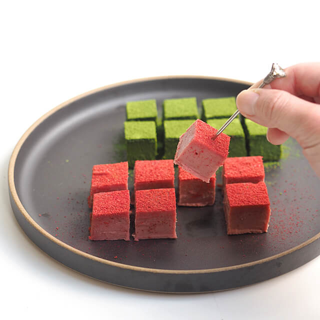 | 5)お好みの大きさにカットし、仕上げにいちごにはストロベリーパウダー、抹茶にはさみどりを茶こしで振る。 | |