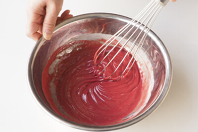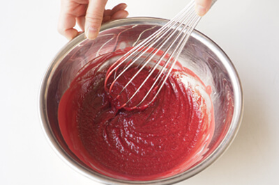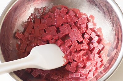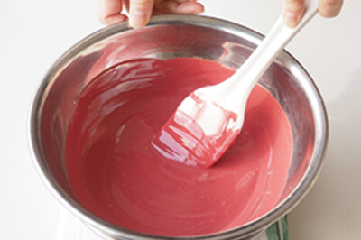 | 1)ボールに彩味(いちごまたは抹茶)を入れ、50~60℃程度の湯せんにかけて溶かす。 | |