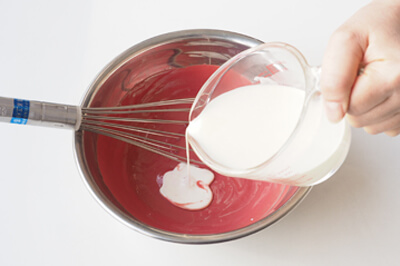 | 3)2を1に4~5回に分けて加え、その都度泡立て器でよく混ぜ合わせる。 ※2回目を加えたあたりで分離しますが、さらに加えていくとつながり乳化した状態になります。 |