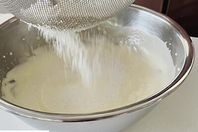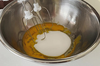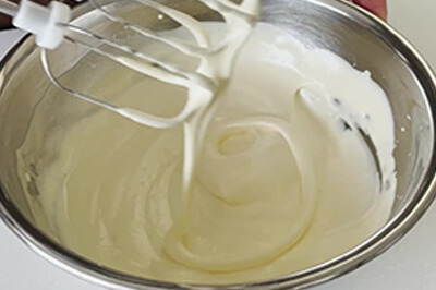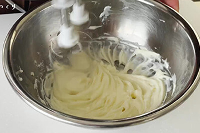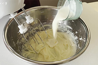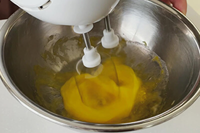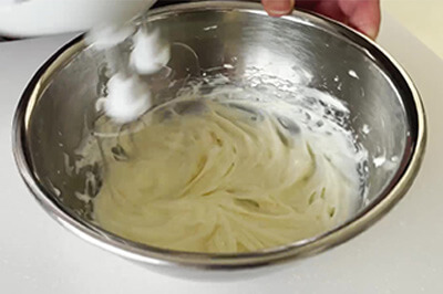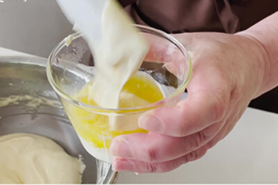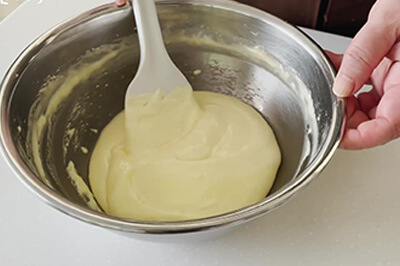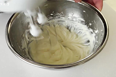 | 6)5)に製菓用グラニュー糖(b)を加え、ゴムベラですり混ぜ、ハンドミキサーで空気を含ませるように混ぜる。 | ![]() ![]() ![]() |