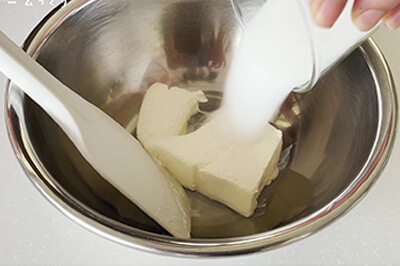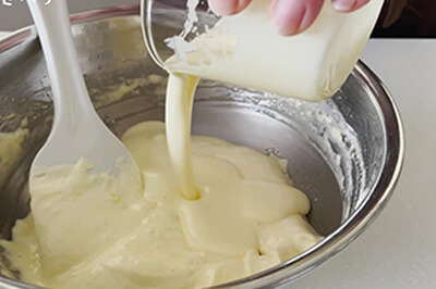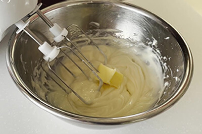 | 生クリーム→レモン汁を加え、その都度混ぜる。 準備しておいた無塩バター(b)を加え混ぜる。 |