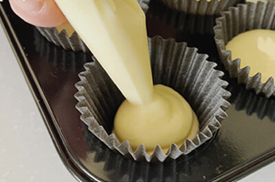 | 7)丸口金(#7)をセットした絞り袋に入れ、冷めた4のカップケーキに絞る。 お好みですりおろしたレモンの皮をトッピングする。 |