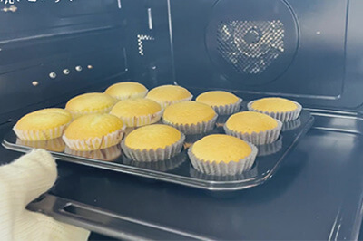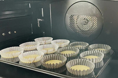 | 4)3)の生地をカップに入れ、170℃に温めたオーブンで約15分焼く。ケーキクーラーの上で冷ます。 | ![]() ![]() ![]() ![]() |