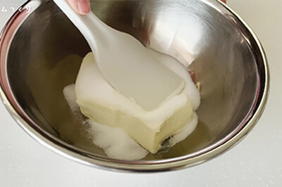 - 無塩バター(b)を室温に戻す。