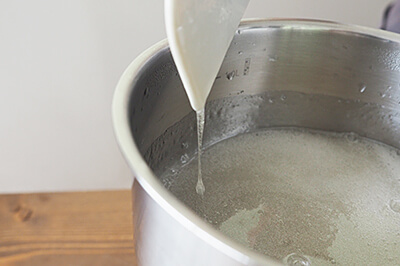 | 1)鍋に水を入れ粉末寒天を加えてゴムベラで混ぜて溶かし、中火で沸騰させ、弱火にして2分加熱する。 | |
