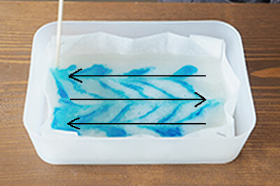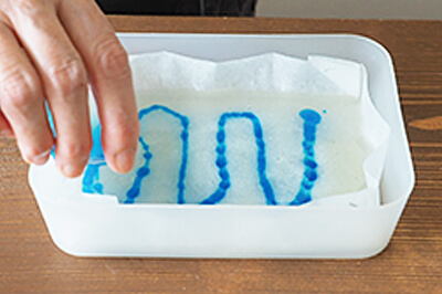 | 3)準備しておいた型に2)を流し入れ、その上にシロップを蛇行させるように入れる。 | ![]() |