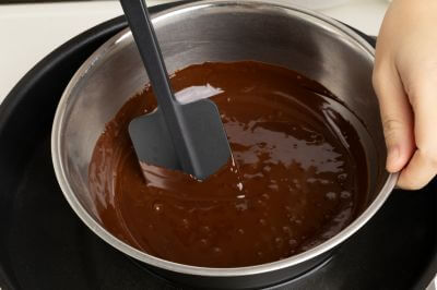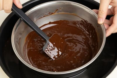 | 3)ボウルを湯煎から外し、刻んだチョコレートをすべて加える。ゴムベラで混ぜながらチョコレートを溶かし、温度を31~32℃まで下げる。 | ![]() |