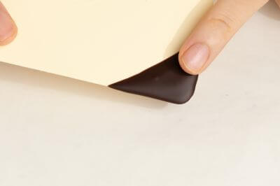 | 4)【テンパリングの確認】 カードに少量のチョコレートをつけ、冷蔵庫で3〜5分冷やす。 |